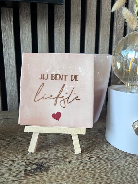 Zachtroze tegel met bronze opdruk.
