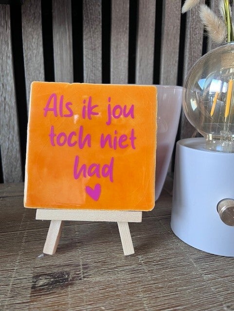 Oranje tegel met roze opdruk.